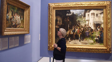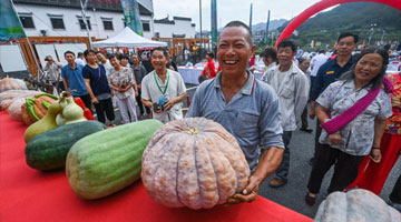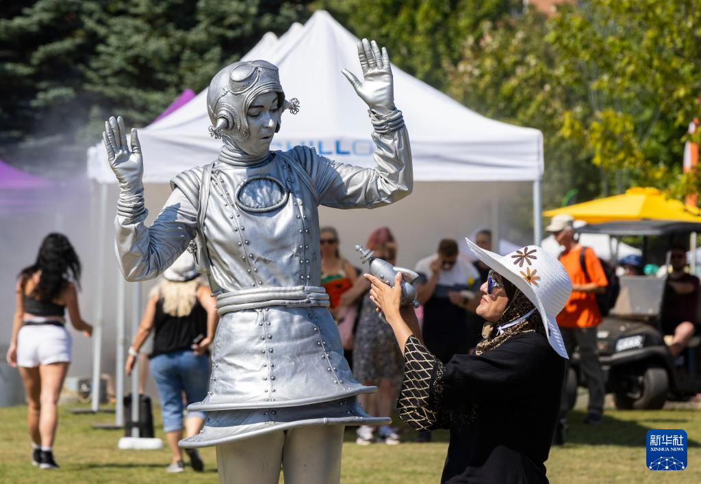 9月4日,在加拿大多伦多国际街头艺人节,一名女子(右)与一名街头艺人摆姿势合影。