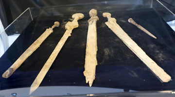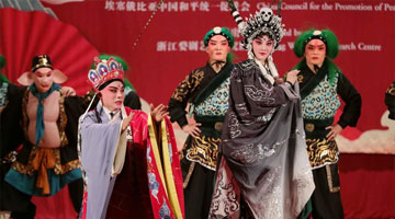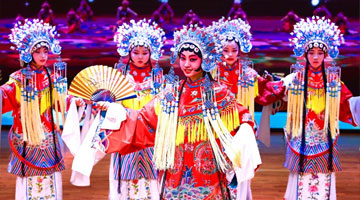 和田地区新玉歌舞团的演员在表演舞剧《五星出东方》片段(9月12日摄)。