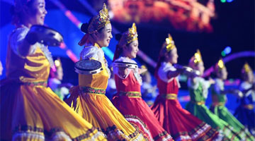 演员在表演各民族联舞《舞动天山》之群舞《中华民族一家亲》(9月12日摄)。
