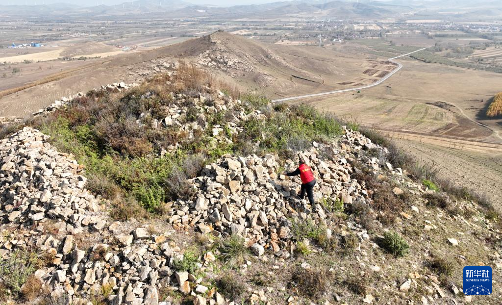 10月11日,关富军攀上长城一座烽火台巡查(无人机照片)。
