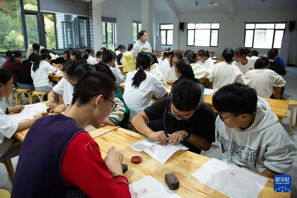 10月24日,在安徽省黄山市歙县老胡开文墨业有限公司,前来研学的学生在体验拓印墨模。