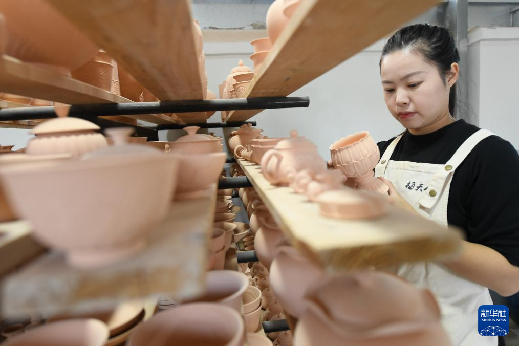 10月31日,在“梅夫人”工作室,季资美吹去瓷坯上的灰尘,准备装窑烧制。