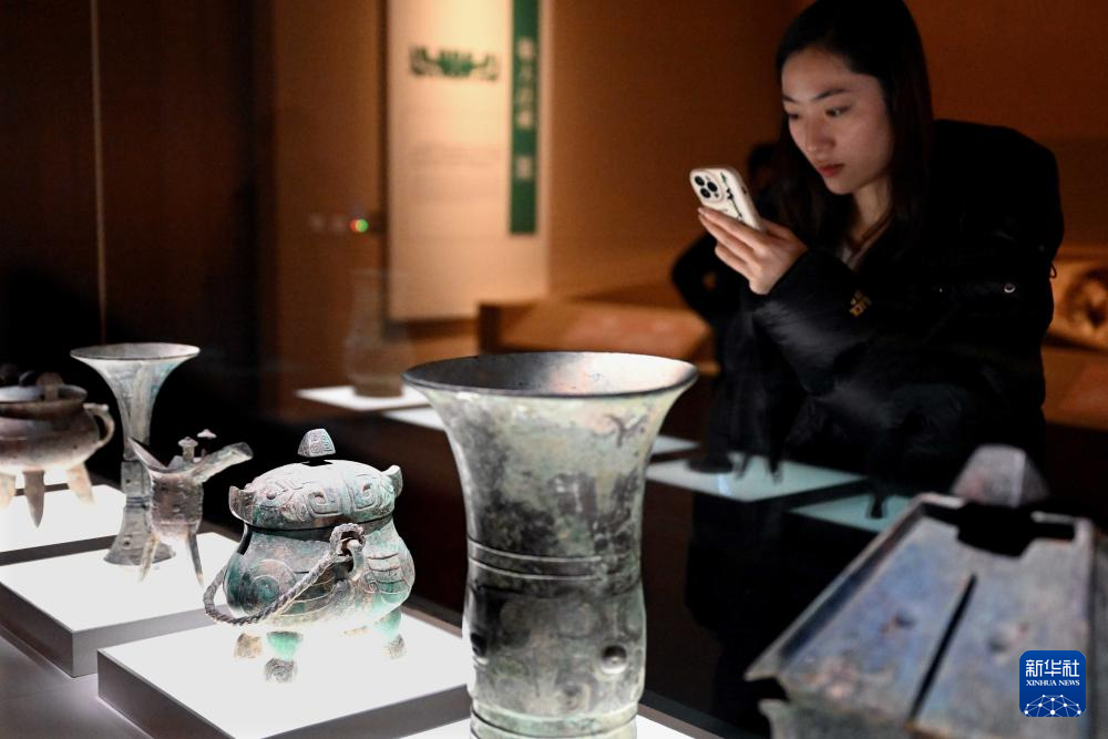 2月26日,参观者在河南安阳殷墟博物馆新馆内拍摄展品。