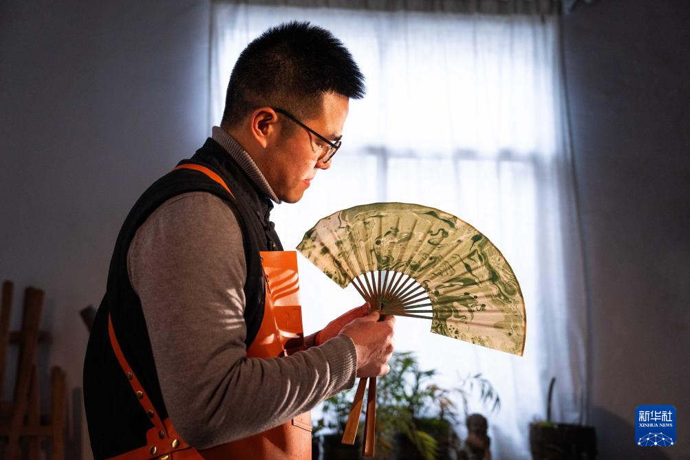 2月28日,郝冠雄在晾晒制作的漆扇。