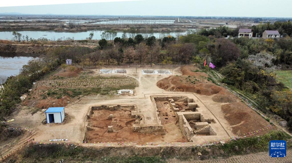 图为磨盘山遗址马家浜文化晚期房址发掘现场(2023年12月1日摄,无人机照片)。