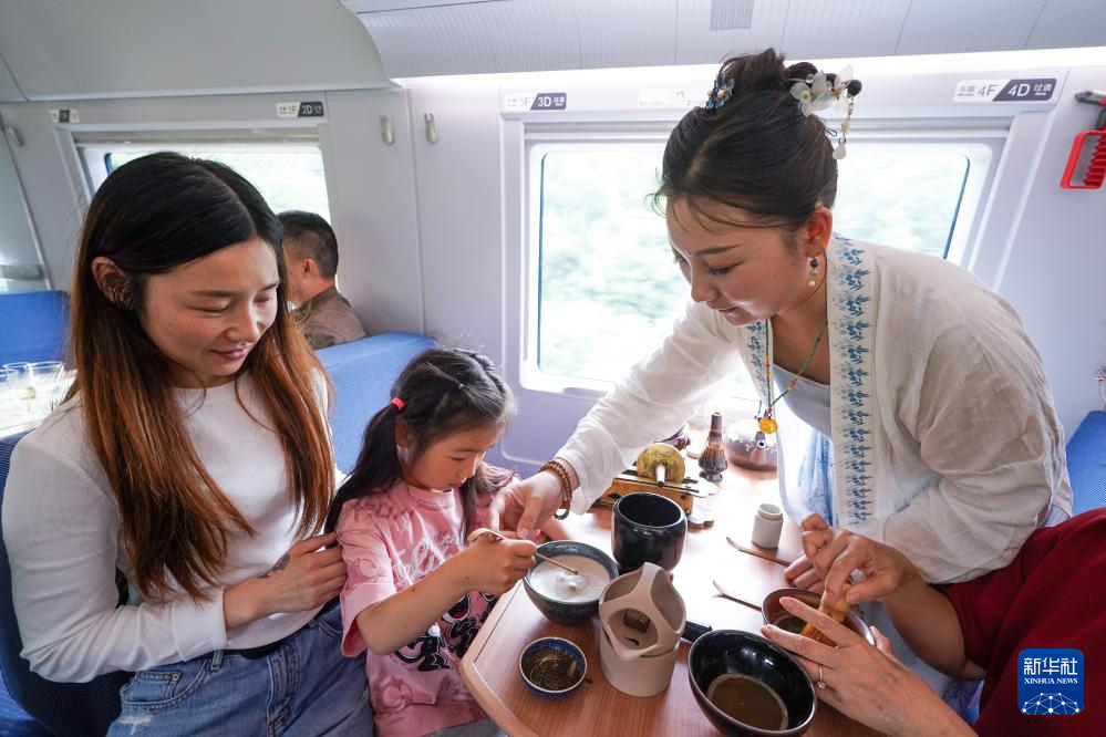 5月20日,南京客运段工作人员在G2807次高铁列车车厢内请旅客品茶。