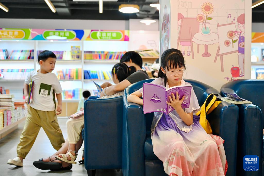 7月6日,小朋友们在福州新华书店鳌峰坊书城内读书纳凉。