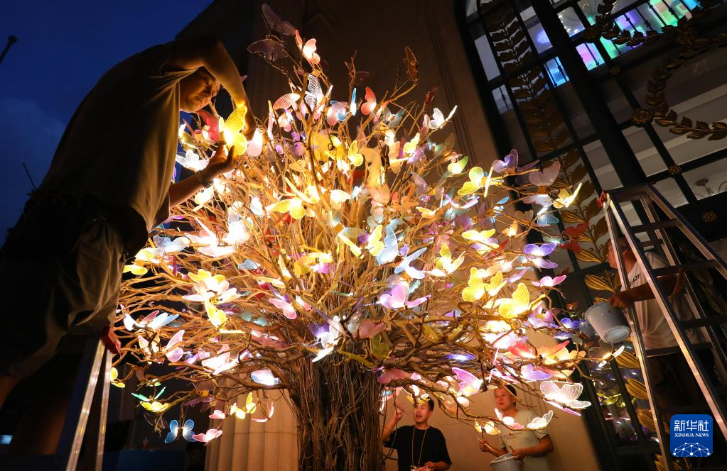 9月18日,工作人员安装调试灯光装饰艺术作品。