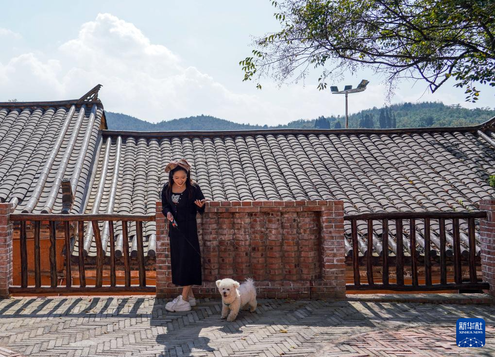 10月30日,一名外地旅居客在土瓜冲村里遛狗散步。