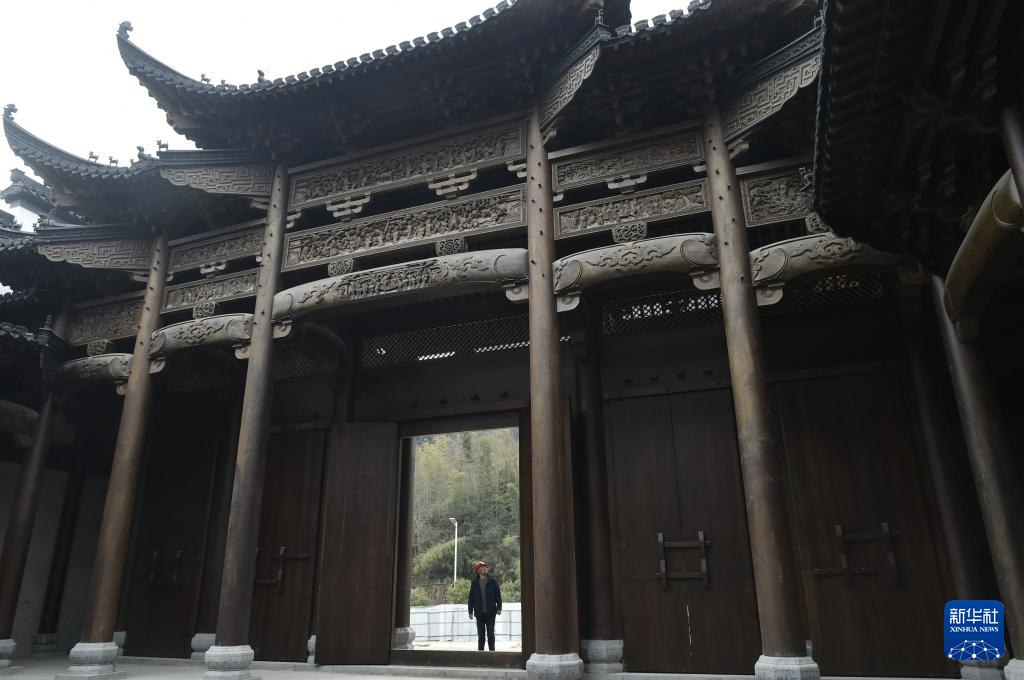 1月6日,工人在黄山徽匠园林古建有限公司厂区搭建徽派仿古建筑。