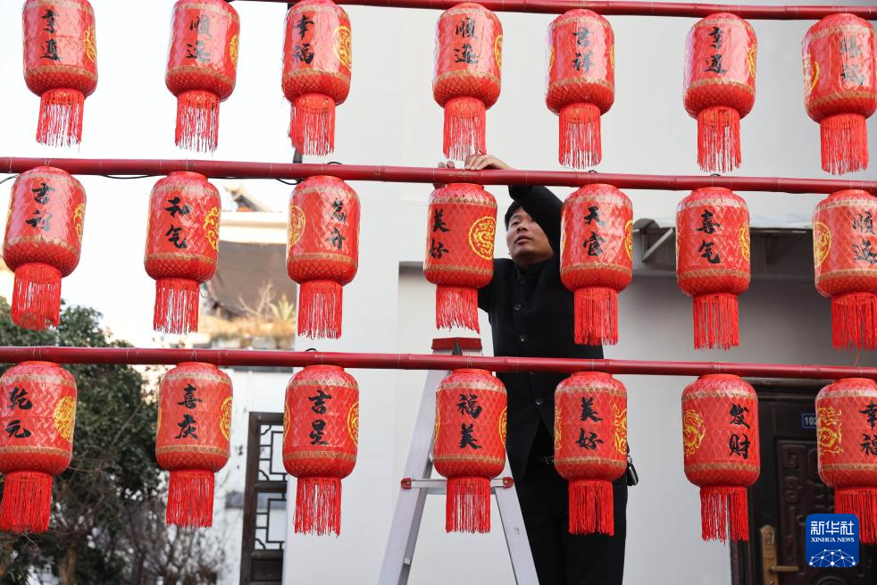1月19日,工人在浙江省湖州市德清县乾元镇谈家弄整理灯笼。