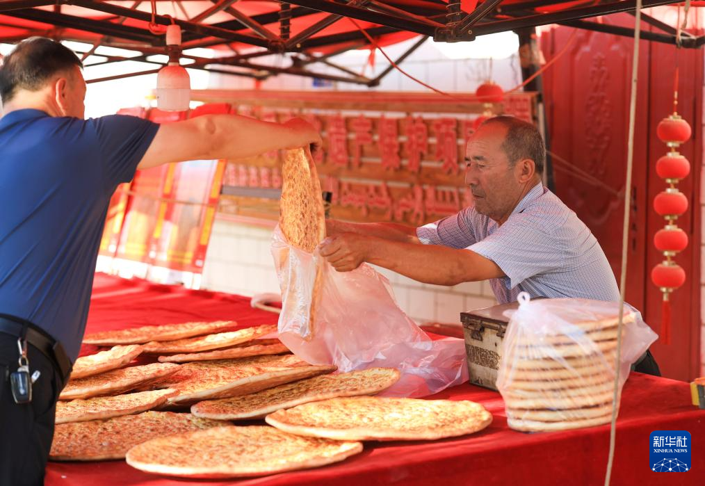 7月21日,在新疆库车市,热西提将馕打包后准备给顾客送货。