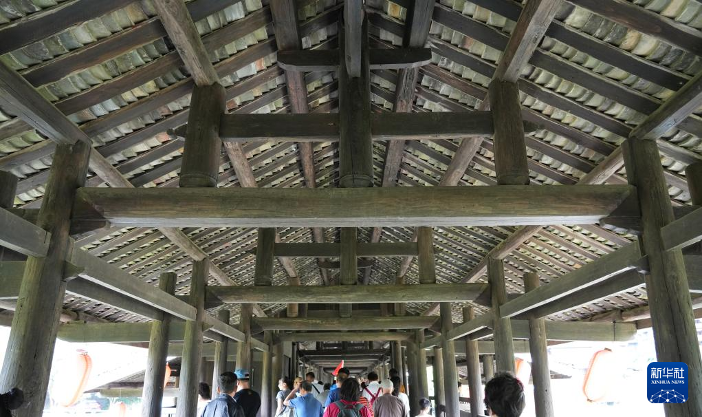 9月25日,游人行走在三江侗族自治县程阳永济桥上。