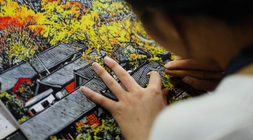 10月25日,在瑞士首都伯尔尼,小朋友在“遇见中国”文化节上体验制作漆扇。