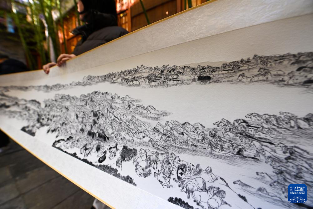 这是12月29日在天津古文化街“喜迎马年,五代画马人马画艺术展”上拍摄的画家宫春虎的作品《万马图》(局部)。