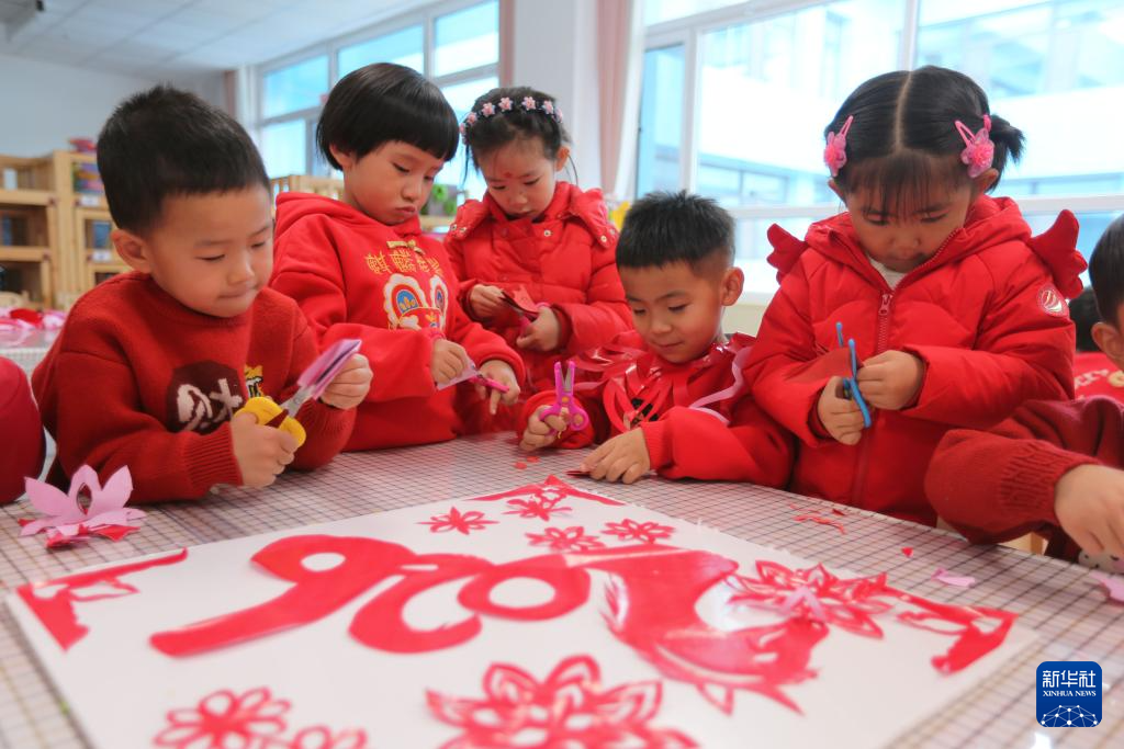 12月29日,河南省焦作市温县第三幼儿园的小朋友在进行迎新年剪纸创作。
