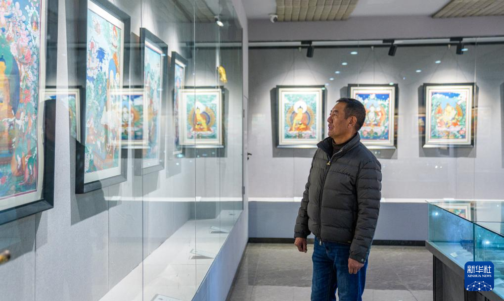 这是2月10日拍摄的西藏唐卡画院展厅。陈列的唐卡中有许多罗布斯达的作品。