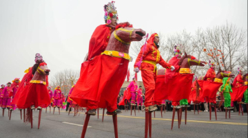 3月1日,甘肃省白银市会宁县会师镇北关社火队在会宁县城进行高跷巡演。