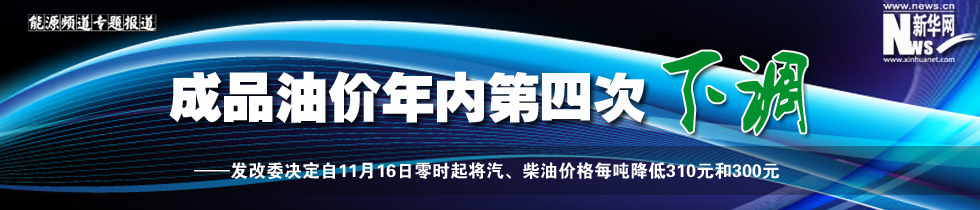 發(fā)改委決定自11月16日零時起將汽、柴油價格每噸降低310元和300元,折算到90號汽油和0號柴油(全國平均)每升零售價分降0.23元和0.26元。 [詳細(xì)]