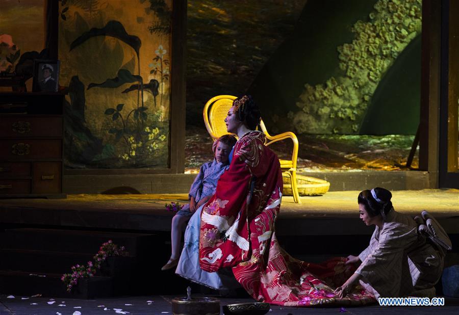 Chinese artists perform Madama Butterfly during the 63rd Puccini Festival in Viareggio, Italy, on Aug. 18, 2017. The China National Opera House performed Madama Butterfly in Puccini's former home Torre del lago of Viareggio on Saturday, after it first brought Turandot here during the 61st Puccini Festival in 2015. (Xinhua/Jin Yu)