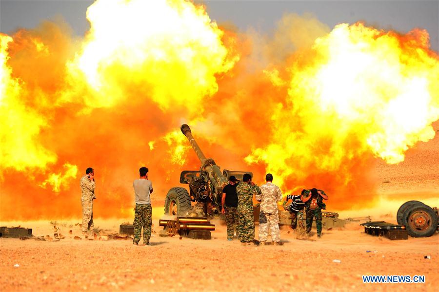 Syrian army soldiers fire an artillery on the Islamic State (IS) positions near the city of al-Bukamal in the eastern countryside of Deir al-Zour province, Syria, on Nov. 10, 2017.?(Xinhua/Ammar Safarjalani)