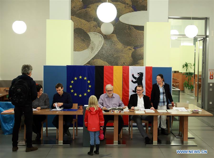 Working staff help voters to cast ballot at a polling station in Berlin, Germany, on Sept. 24, 2017.(Xinhua/Luo Huanhuan)