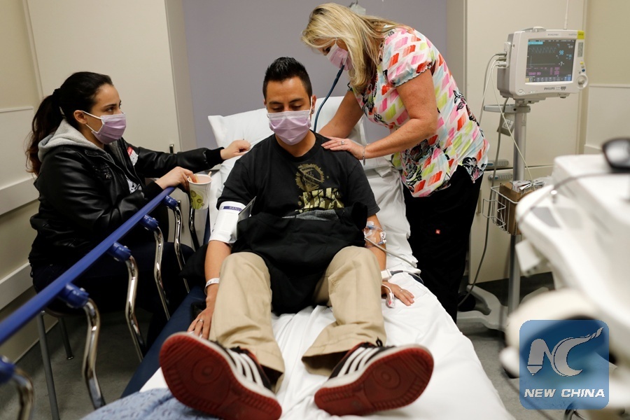 Emergency room nurse Christine Bauer treats Joshua Lagade of Vista, California, for the flu as his girlfriend Mayra Mora looks on in the emergency room at Palomar Medical Center in Escondido, California, the United States, on Jan. 18, 2018. (Xinhus/ REUTERS)