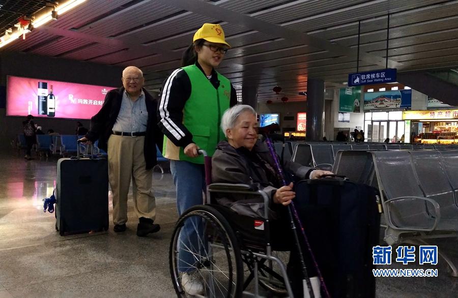 A volunteer offers help to a senior citizen at a railway station in Zhangzhou, east China’s Fujian Province, Feb. 2, 2018. (Xinhuanet/Wu Amin)