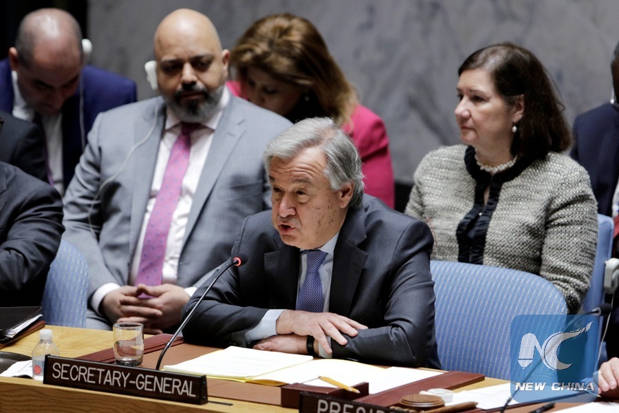 United Nations Secretary-General Antonio Guterres(front) briefs the Security Council meeting on the situation in Syria, at the UN headquarters in New York, March 12, 2018. (Xinhua/Li Muzi)
