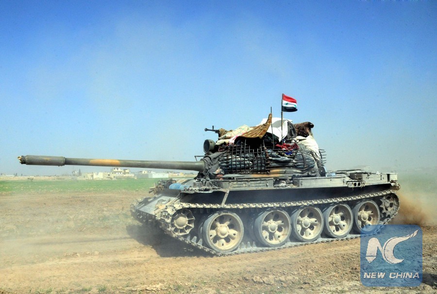A Syrian tank is seen at the town of Muhamadiyeh, east of Damascus, capital of Syria, on March 6, 2018. The Syrian army on Tuesday fully captured the town of Muhamadiyeh in the capital Damascus' Eastern Ghouta countryside, the latest in a series of victories the Syrian army achieved in the war on the rebel groups in that sprawling area, according to state news agency SANA. (Xinhua/Ammar Safarjalani)