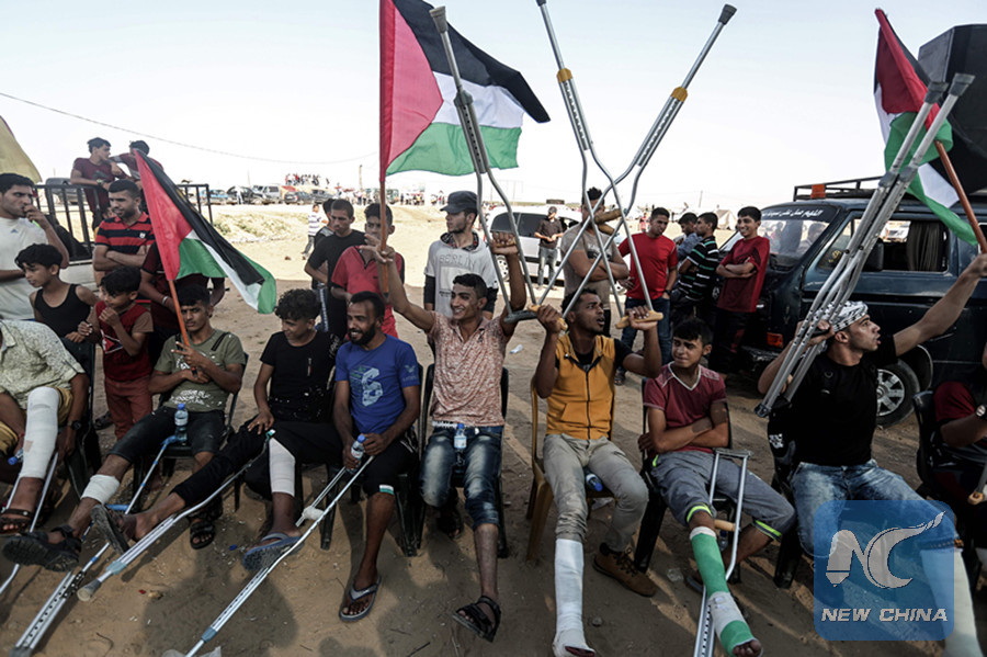 Palestinian woundeds by Isreali forces gather during a demonstration along the border between the Gaza strip and Israel, east of Gaza city on June 22, 2018. (AFP photo)