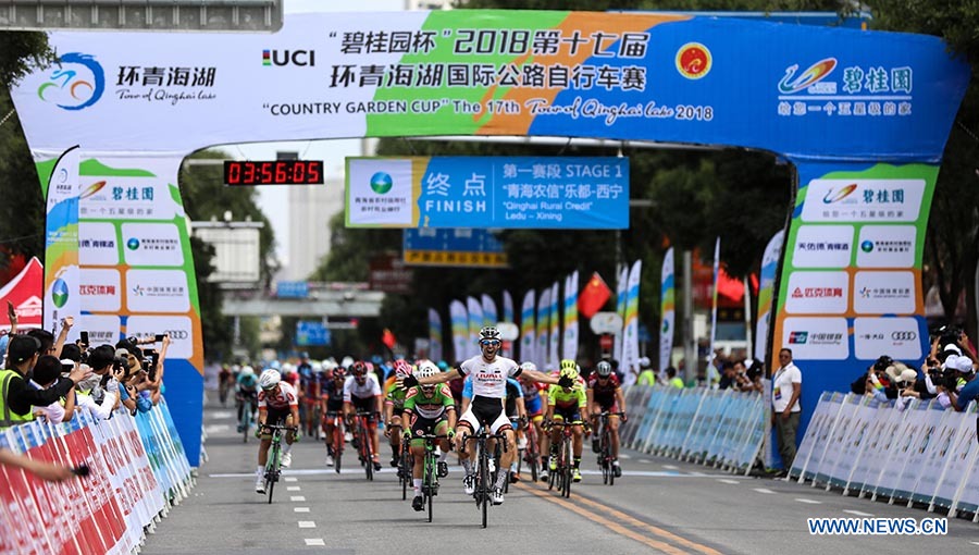 Georgios Bouglas from China's Ningxia Sports Lottery Livall Cycling Team (NLC) wins the first stage of the Tour of Qinghai Lake in northwest China's Qinghai Province, on July 22, 2018. (Xinhuanet Photo by Jia Haiyuan)