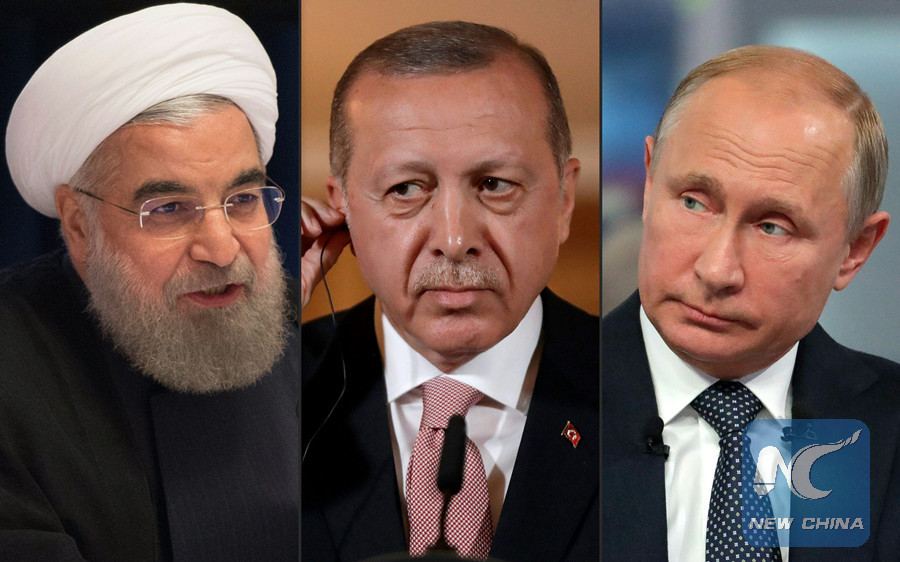 This combination of pictures created on September 6, 2018 shows (L to R): Iran's President Hassan Rouhani speaking on September 22, 2016 in New York; Turkey's President Recep Tayyip Erdogan during a press conference on May 15, 2018 in London; and Russian President Vladimir Putin during a televised phone-in on June 7, 2018 in Moscow. (AFP photo)