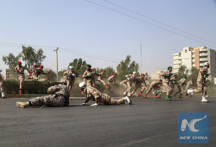 Iranian soldiers take shelter during a terror attack in a military parade in Ahvaz, Iran, Sept. 22, 2018. (Xinhua/ISNA/Morteza Jaberian)