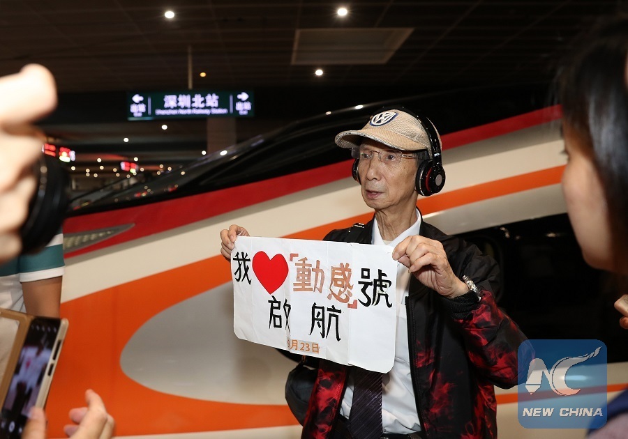 HONG KONG, Sept. 23 (Xinhua) -- "It's so fast!" said Hong Kong resident Leung Shing, as high-speed train G5736 pulled into the Shenzhen North Railway Station in Guangdong Province on the Chinese mainland Sunday morning.