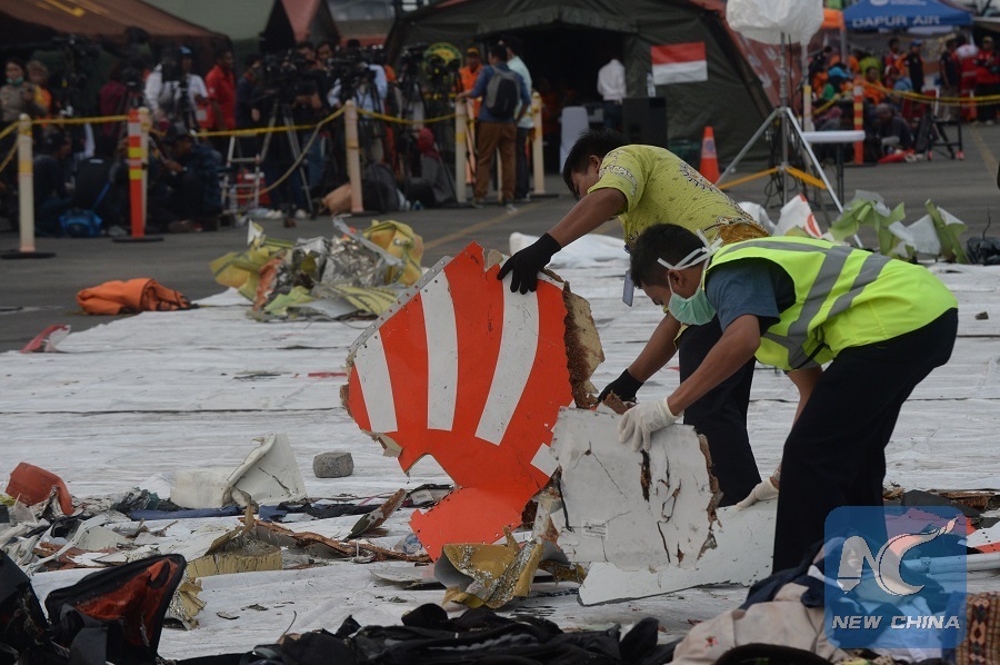Members of the National Transportation Safety Committee (KNKT) collect debris of the crashed Lion Air JT 610 at Tanjung Priok port, Jakarta, Indonesia, Nov. 2, 2018. (Xinhua/Agung Kuncahya B.)