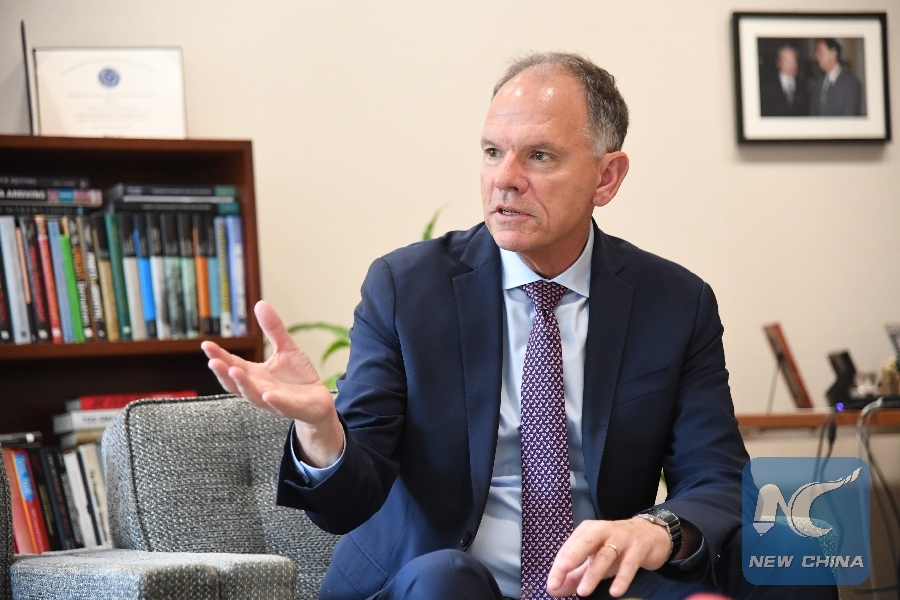 Geoffrey Garrett, dean of the Wharton School at the University of Pennsylvania, speaks to Xinhua during an exclusive interview in Philadelphia, the United States, April 19, 2019. (Xinhua/Yang Chenglin)
