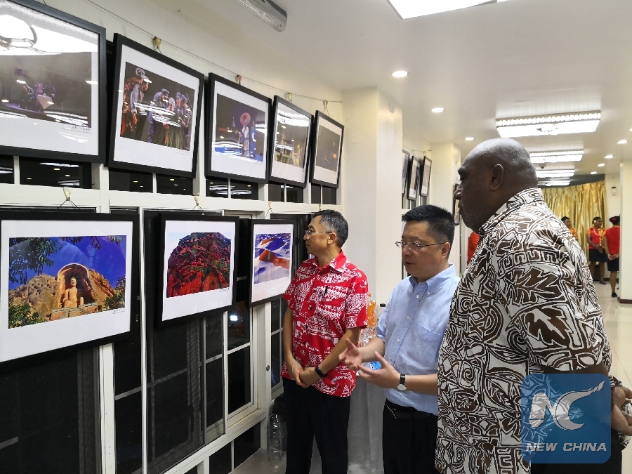 Chinese Ambassador to Fiji Qian Bo (Center) and Director of China Cutural Center in Fiji Deng Xianfu (Left) view the exhibits with Fiji's Minister for Fisheries Semi Koroilavesau (Right) during the China Tourism & Culture Week and Food Festival held in Suva, Fiji, May 29, 2019. (Xinhua/Zhang Yongxing)