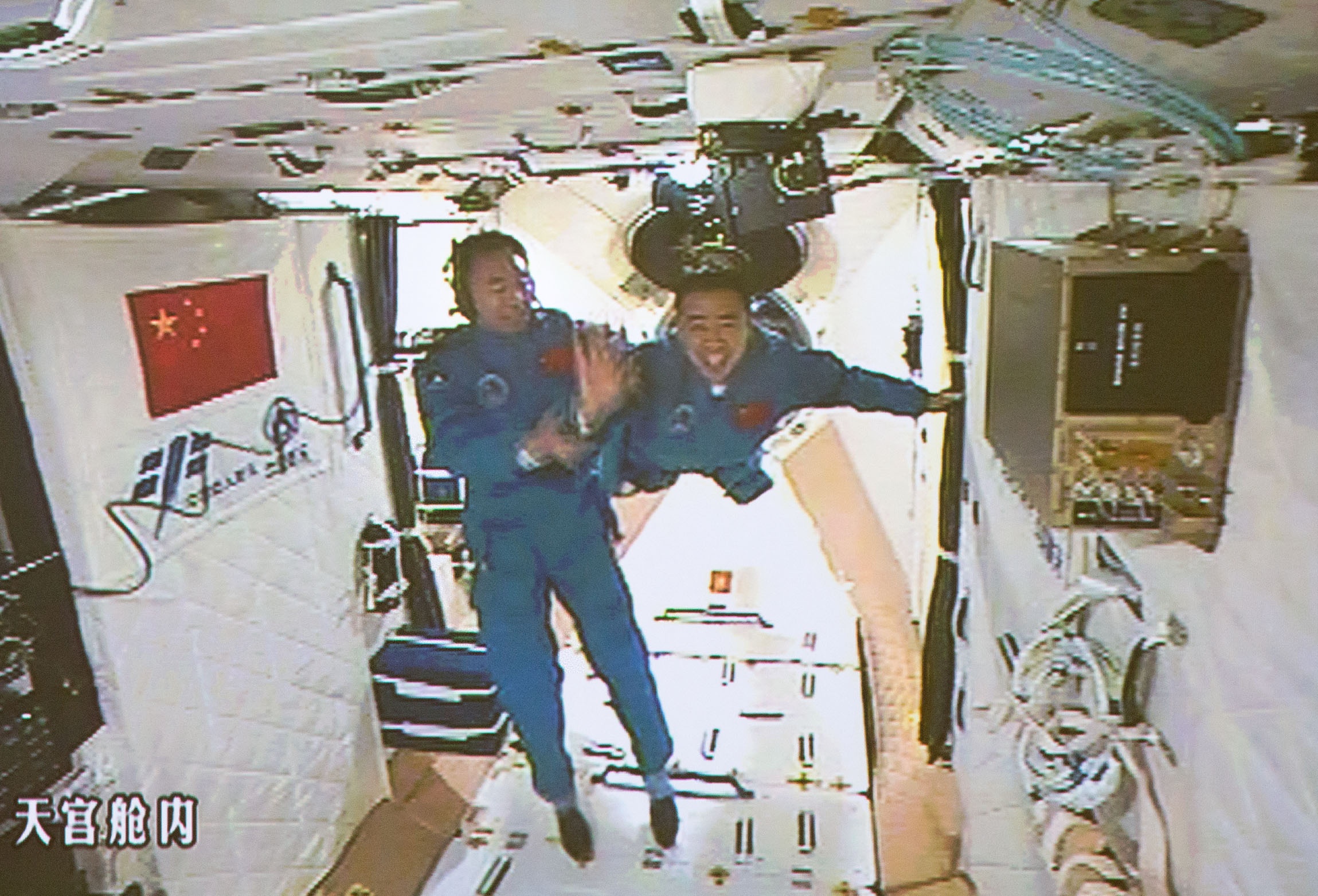 The screen at the Beijing Aerospace Control Center shows the two Chinese astronauts Jing Haipeng and Chen Dong entering the space lab Tiangong-2 on Oct. 19, 2016.