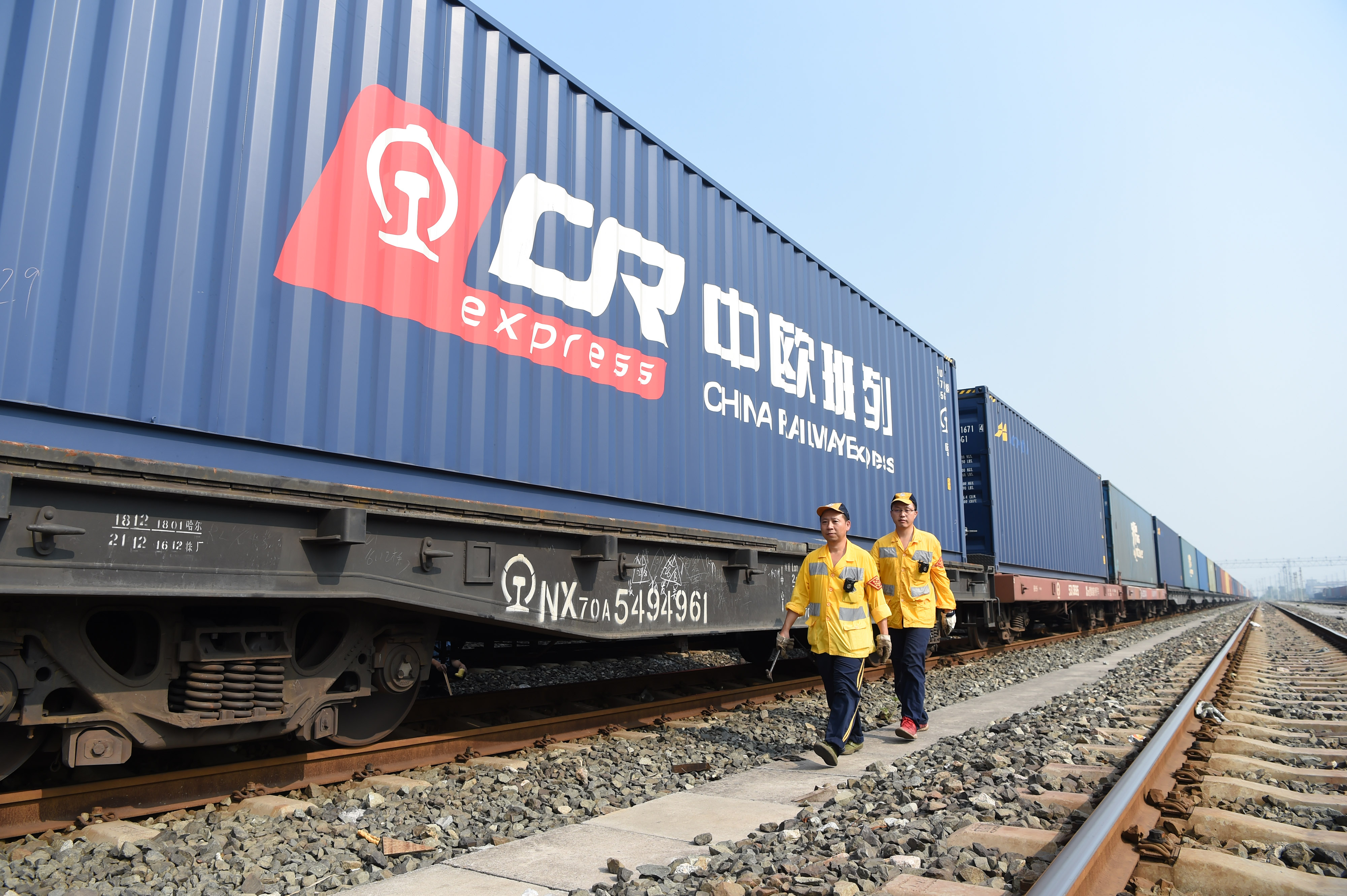 Staff members walk by a freight train at the checking site of the China Railway (CR) Express from the city of Chongqing to European countries before its departure in Shapingba District of Chongqing, southwest China, Aug. 29, 2018.(Xinhua/Tang Yi)