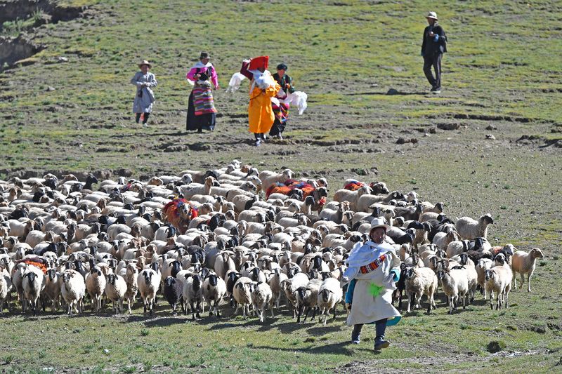 Scene of sheep counting ceremony in Zhexia Township, southwest China's Tibet Autonomous Region.(Xinhua/Li Xin)