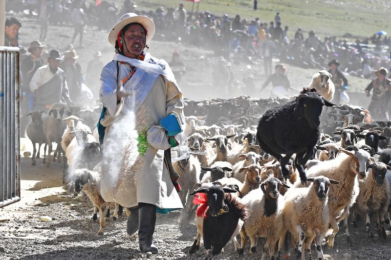 A herdsman scatters highland barley to pray for blessings as flocks of sheep enter the stadium for the sheep show in Zhexia Township, southwest China's Tibet Autonomous Region. (Xinhua/Li Xin)