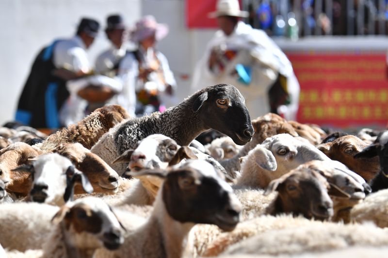 XIGAZE, Sept. 11, 2019 (Xinhua) -- Sheep show, or sheep counting, is a traditional activity at pastoral areas in southwest China's Tibet Autonomous Region. During the show, herdsmen showcase and count the number of their sheep. They also pick out and eulogize their bellwethers in a symbolic gesture to pray for good growth of livestock in the next year. A sheep show was just held in Zhexia Township, Xigaze City of Tibet Autonomous Region this Monday.