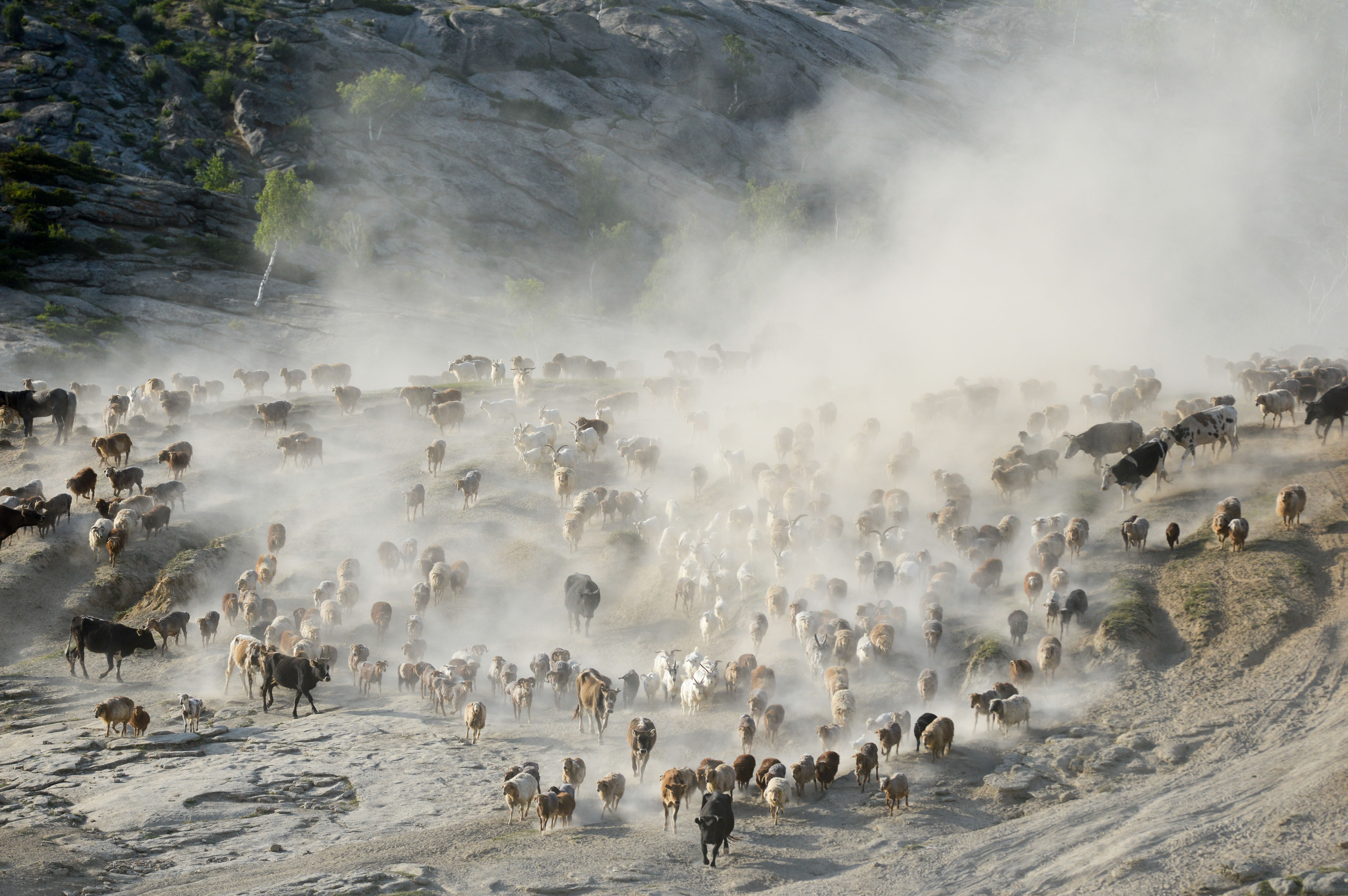 A flock of livestock are on a trip for summer pasture, northwest China's Xinjiang Uygur Autonomous Region. (Xinhua/Ding Lei)