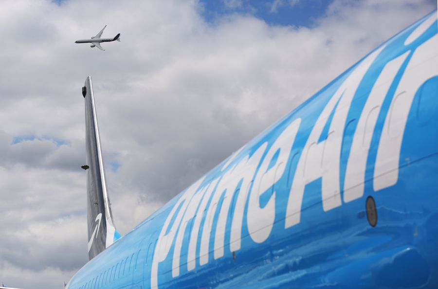 An Airbus A350-000 flies over a 737-800 Boeing Converted Freighter during a flight display at the 53rd International Paris Air Show held at Le Bourget Airport near Paris, France, June 20, 2019. (Xinhua/Gao Jing)