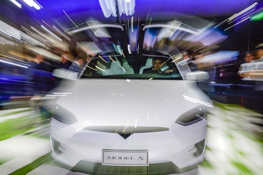 A visitor tries the Tesla Model X at the first China International Import Expo in Shanghai, east China, Nov. 7, 2018. (Xinhua/Shen Bohan)
