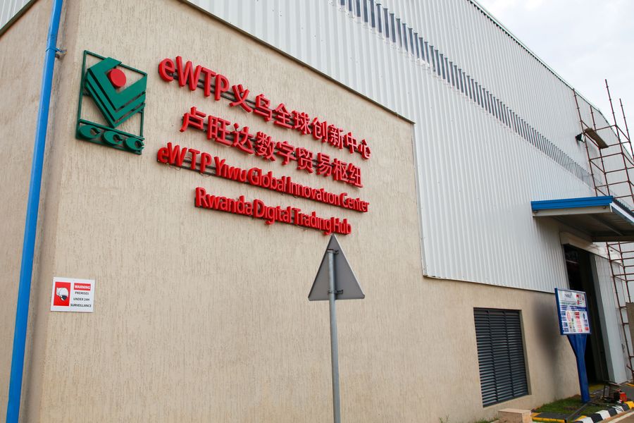 The photo shows a logo of Rwanda Digital Trading Hub of Alibaba Electronic World Trade Platform Yiwu Global Innovation Center at the Kigali Logistics Platform in Kigali, Rwanda, on Sept. 7, 2019. (Xinhua/Lyu Tianran)