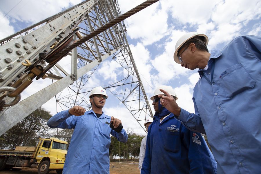 Chinese engineer Liu Nian (1st L) communicates with Brazilian co-workers at the construction site of Belo Monte ultra-high-voltage transmission projects launched by the State Grid Corporation of China in Brazil, Aug. 7, 2018. (Xinhua/Li Ming)
