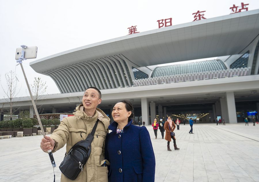 Citizens take a selfie in front of Xiangyang East Railway Station of Wuhan-Shiyan high-speed railway in Xiangyang City, central China's Hubei Province, Nov. 26, 2019. (Xinhua/Xiong Qi)