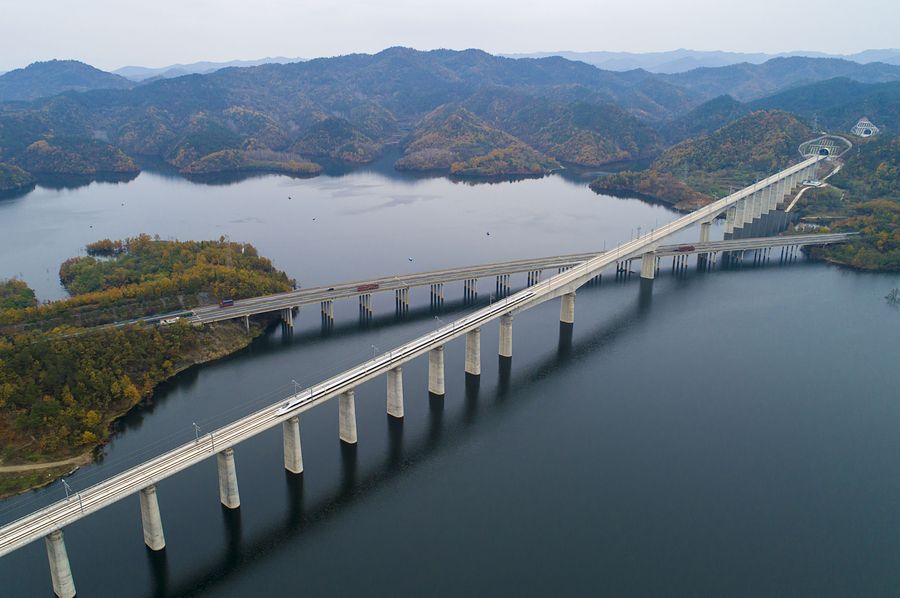 Aerial photo taken on Nov. 26, 2019 shows a train running on a bridge over the Danjiangkou reservoir during a trial of Wuhan-Shiyan high-speed railway in central China's Hubei Province. (Xinhua/Xiong Qi)
